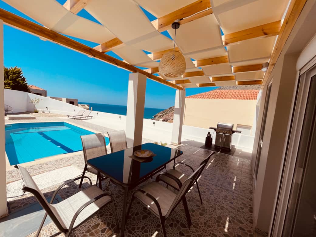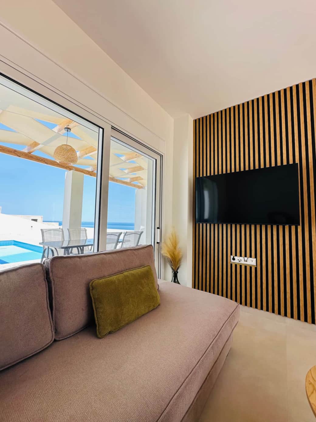 Vom Esstisch im offenen Wohnbereich aus hast du einen herrlichen Blick auf das Meer und den privaten Garten. Verbringe die Abende im Wohnzimmer mit großem Sofa und TV-Gerät oder bestaune den Sonnenuntergang am großzügigen Esstisch im privaten Garten.